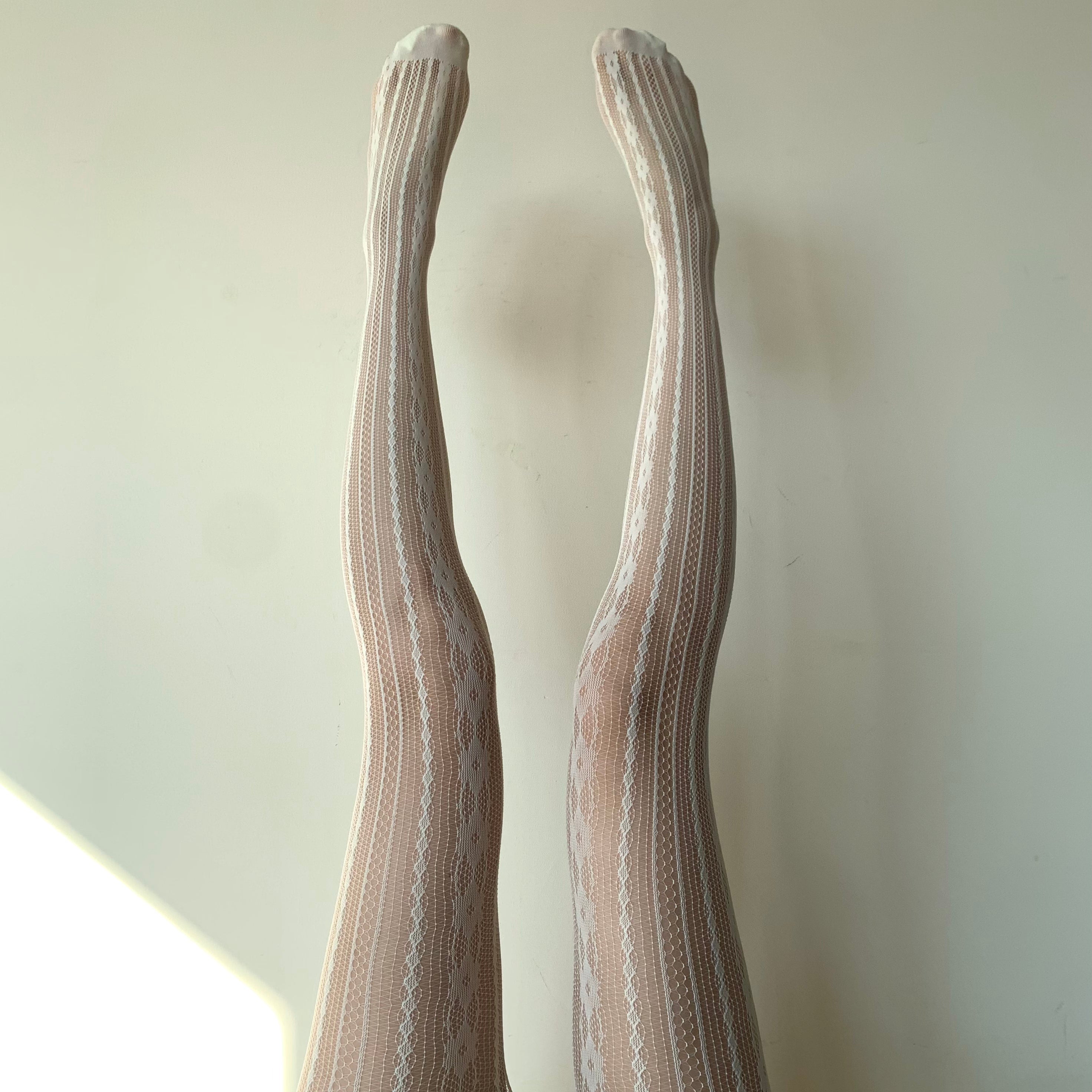 Cream White Floral Striped Fishnet Tights